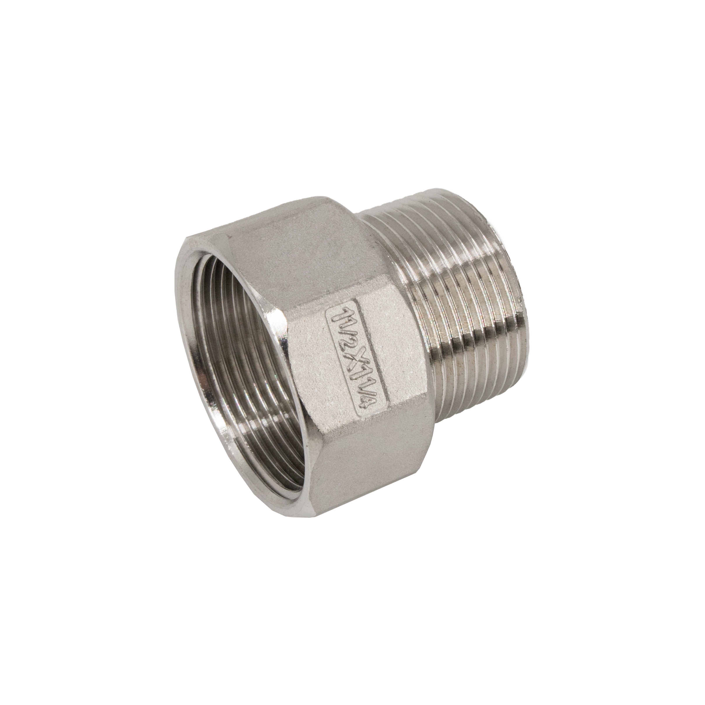 Футорка обратная нержавеющая, AISI304 DN40 x DN32 (1_1/2" x 1_1/4"), (CF8), PN16 — специальный переходной фитинг, предназначенный для соединения трубопроводных элементов разного диаметра. Деталь имеет комбинированную конструкцию: с одной стороны расположена наружная резьба меньшего диаметра, а с другой — внутренняя резьба большего размера.