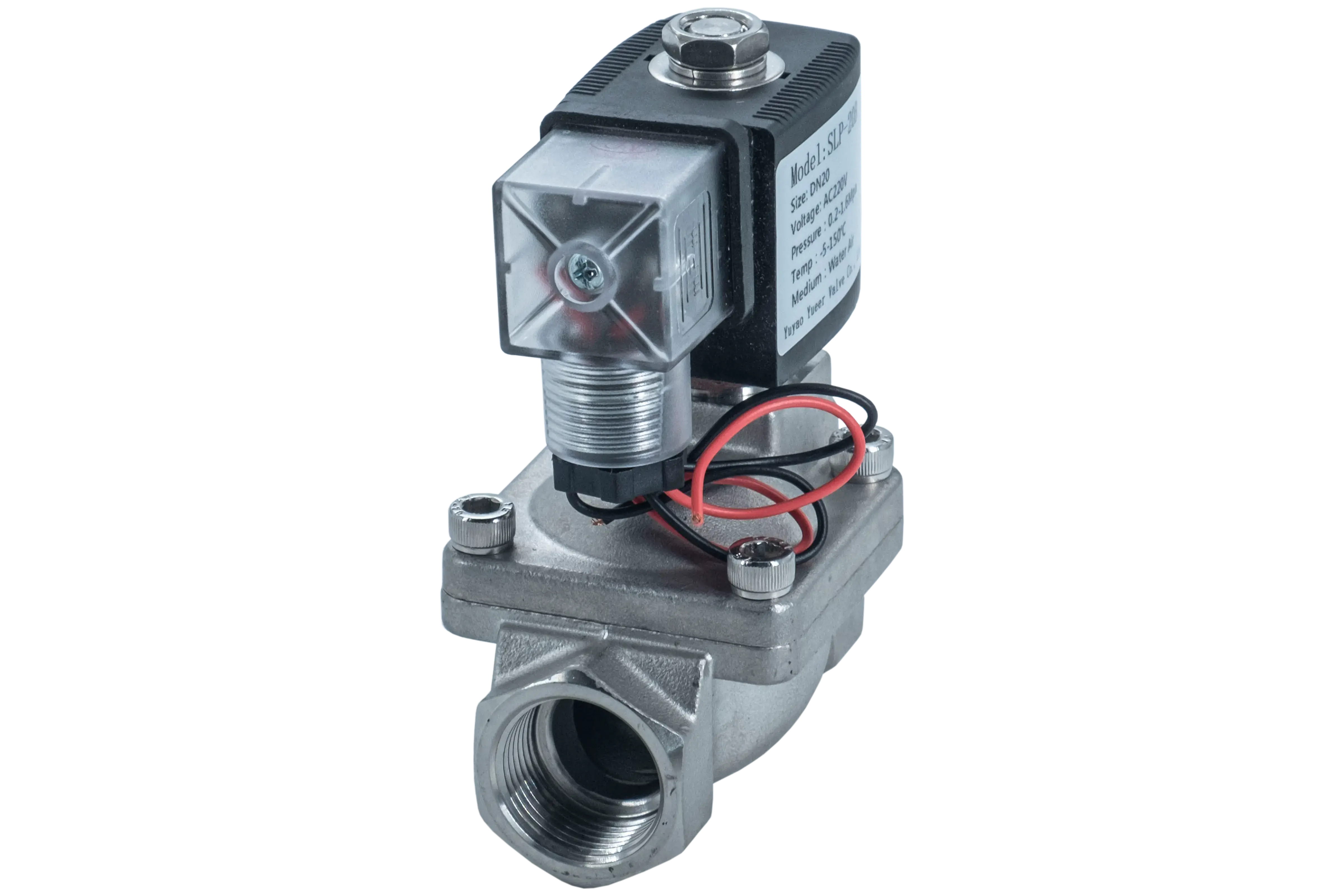 Клапан электромагнитный нержавеющий, обратного действия, нормально закрытый, DN20 (3/4"), PN16, 24AC относится к одному из самых распространённых типов клапанов: в закрытом состоянии без питания и открываются при активации катушки. Принцип действия основан на использовании пилотной камеры и давления рабочей среды, что позволяет управлять потоком с минимальной нагрузкой на электромагнит. Модель серии SLP-20B-24VAC применяется в водопроводах, системах отопления, орошения и производственных процессах.