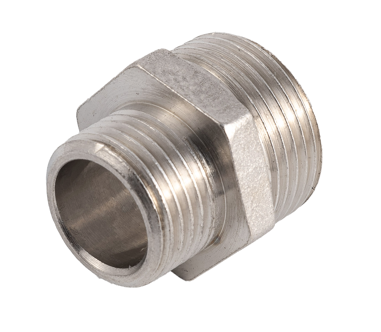 Ниппель резьбовой переходной латунный никелированный, DN20 х DN15 (3/4" х 1/2"), PN40 — компактный соединительный элемент трубопроводов в виде короткой трубки с наружной резьбой на обоих концах. Эти универсальные детали предназначены для герметичного соединения двух частей трубопроводной системы с внутренней резьбой. Правильно подобранный ниппель обеспечивает надежное и долговечное соединение трубопроводных элементов.