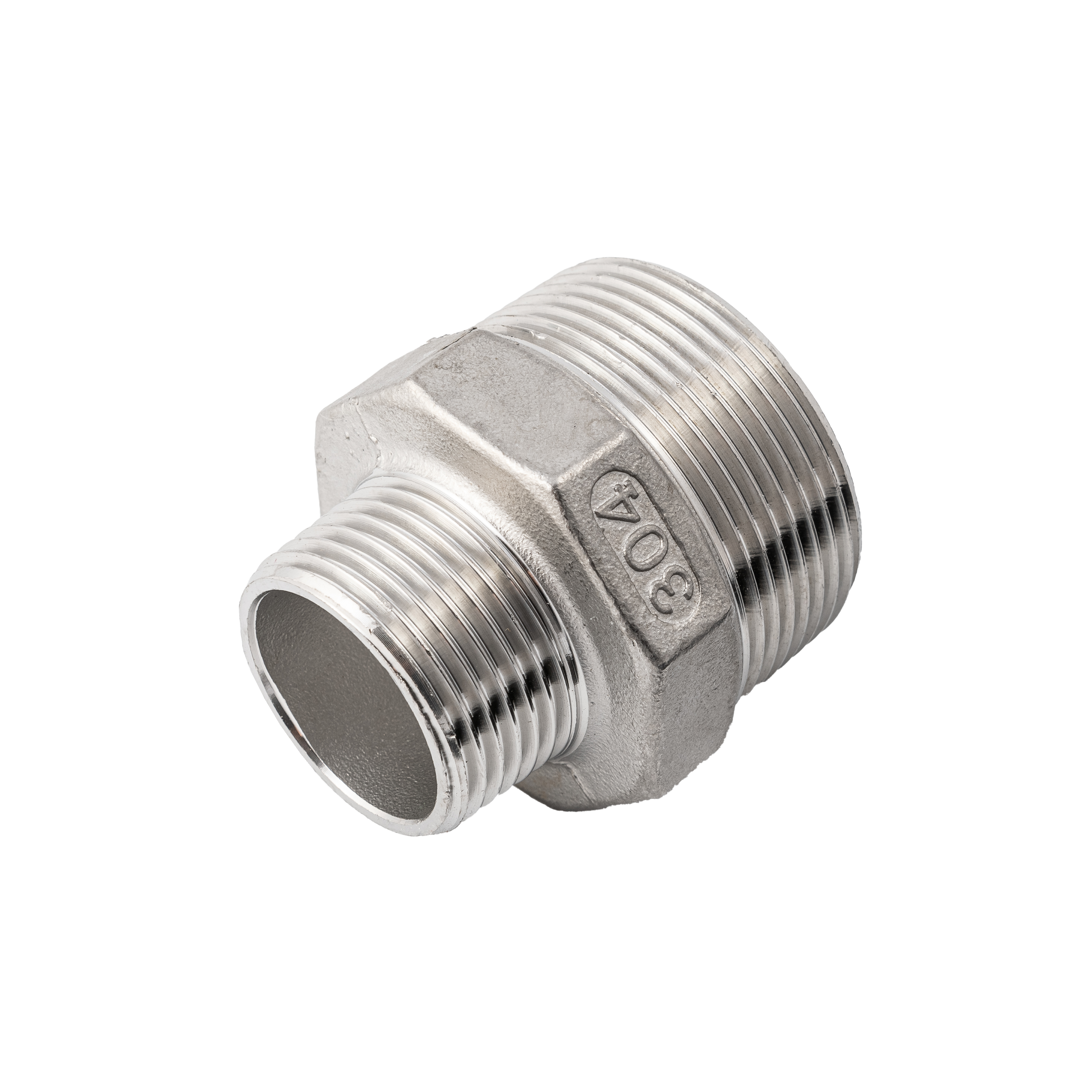 Ниппель резьбовой переходной нержавеющий, AISI304 DN40 х DN25 ( 1_1/2" х 1"), (CF8), PN16 — компактный соединительный элемент трубопроводов в виде короткой трубки с наружной резьбой на обоих концах. Эти универсальные детали предназначены для герметичного соединения двух частей трубопроводной системы с внутренней резьбой. Правильно подобранный ниппель обеспечивает надежное и долговечное соединение трубопроводных элементов.