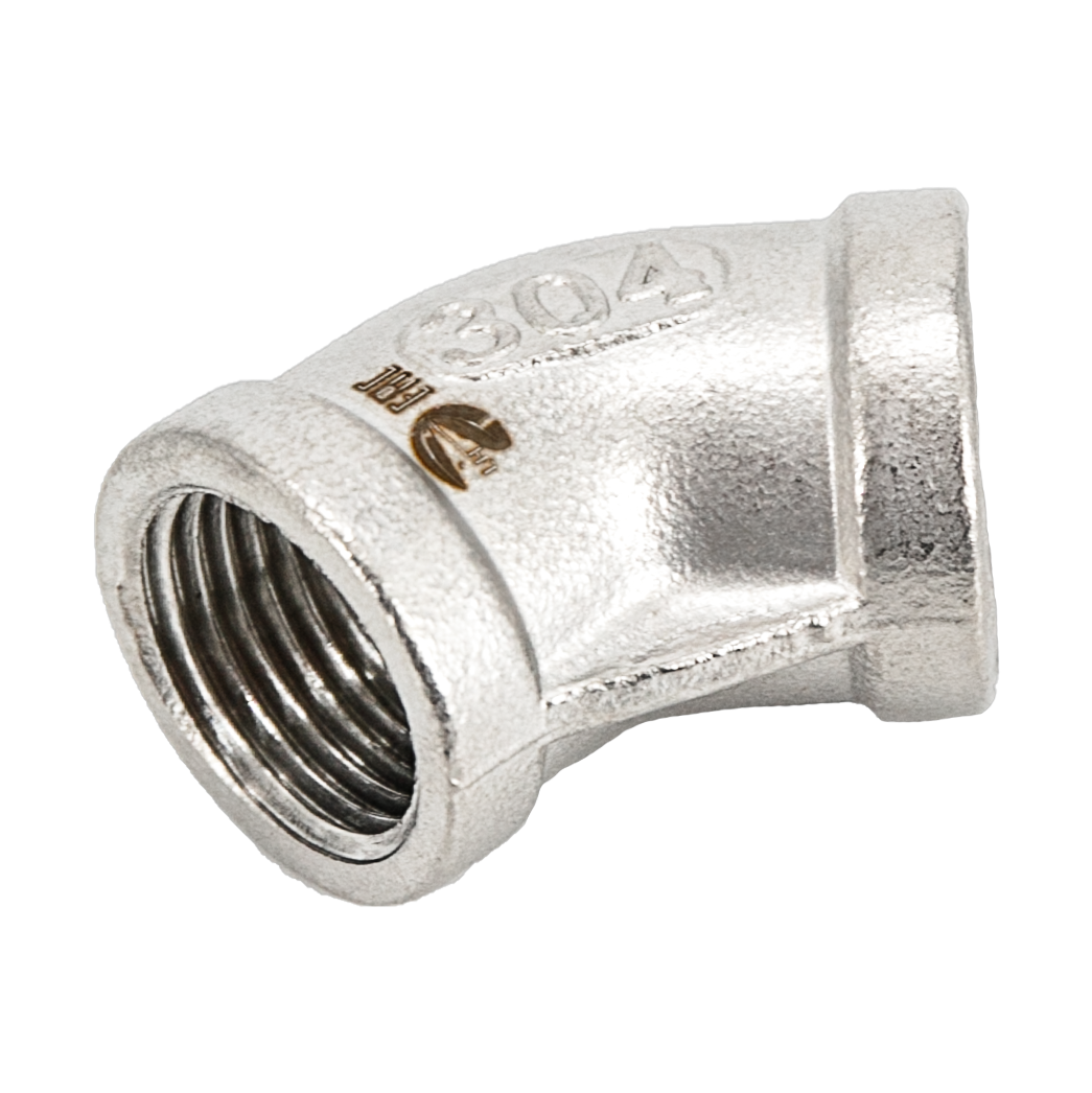 Отвод резьбовой вр/вр 45° нержавеющий, AISI304 DN15 (1/2"), (CF8), PN16 — важный элемент трубопроводных систем, предназначенный для плавного изменения направления потока рабочей среды - жидкости или газа. Эти изделия позволяют создавать повороты трубопровода под необходимыми углами, что обеспечивает правильную конфигурацию всей системы.