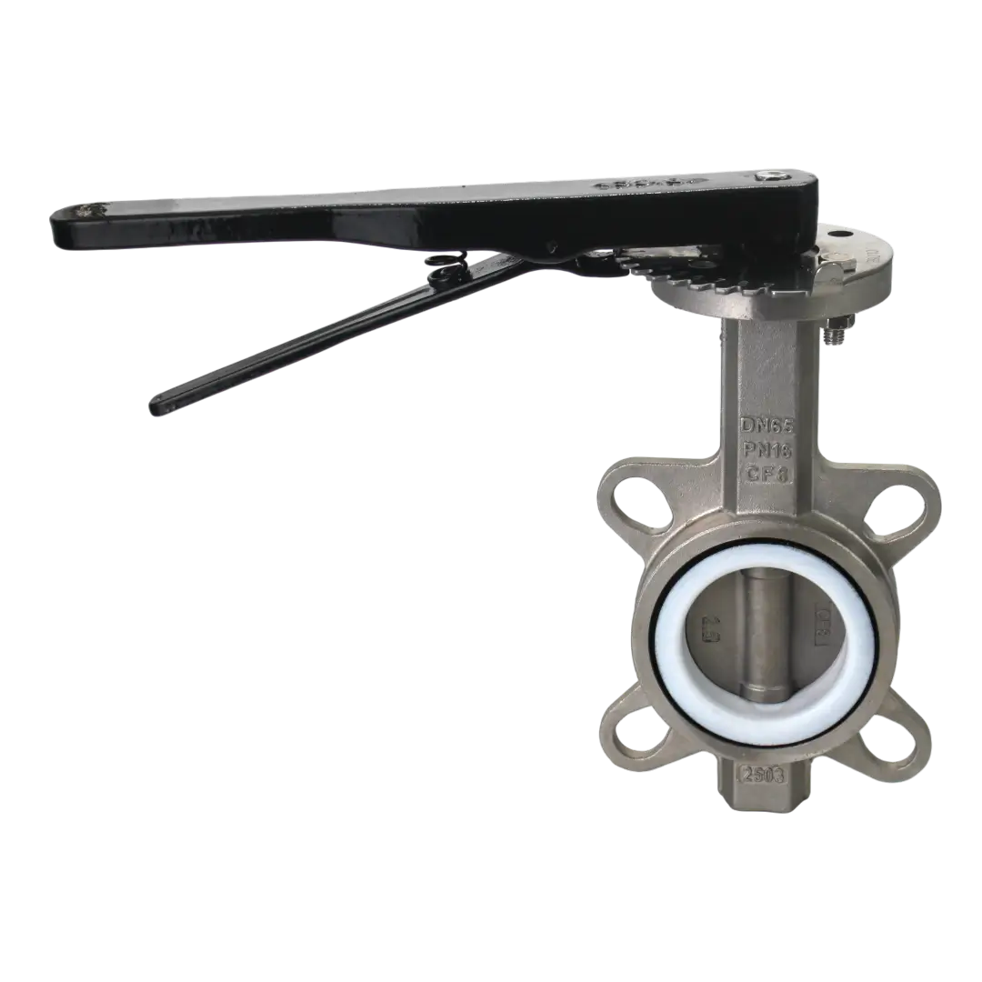 Затвор дисковый межфланцевый нержавеющий AISI304, DN65 (2_1/2"), PN16, PTFE относится к категории поворотной запорной арматуры и предназначен для быстрого перекрытия или регулирования потока среды в трубопроводе. Внутри корпуса расположен диск, который поворачивается вокруг своей оси, перекрывая или открывая поток. Такая конструкция отличается компактностью, малым весом и низким гидравлическим сопротивлением в открытом положении.